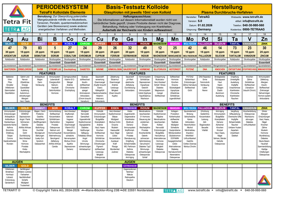 Dem Testset liegt ein umfangreiches "Periodensystem der Kolloide" Faltblatt / Poster im großen DIN-A3-Format als Übersichtsblatt bei. Es enthält eine detaillierte Auflistung der wesentlichen Eigenschaften, physiologischen Wirkweisen sowie der potenziellen Anwendungsbereiche der jeweiligen Kolloide, um eine fundierte und gezielte Testung zu ermöglichen.