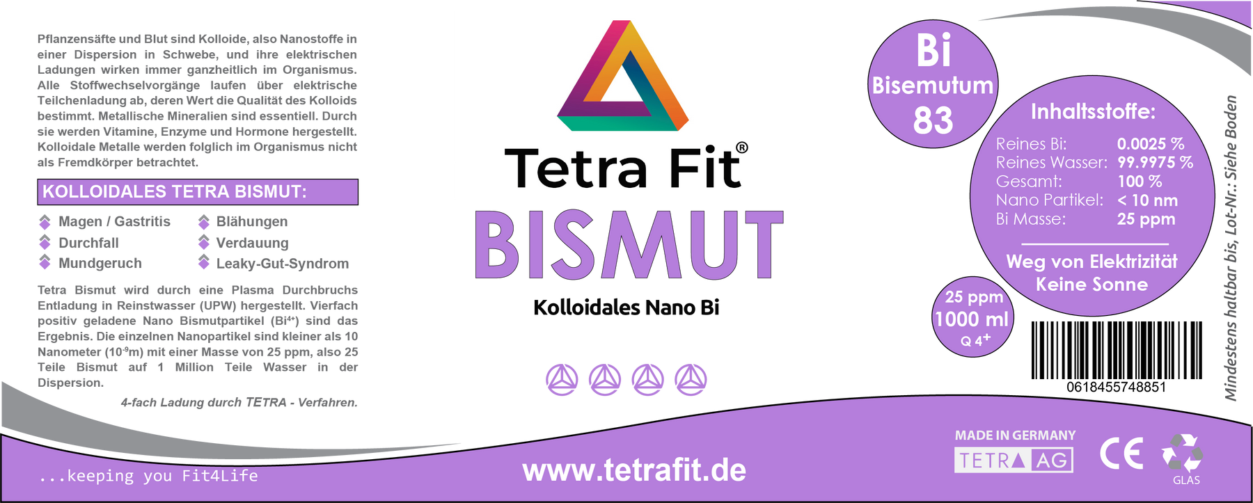 Kolloide sind weder als Lebensmittel, Nahrungsergänzungsmittel noch als Arzneimittel zugelassen und werden ausschließlich unter der Bezeichnung „Tetra Nano Bismut“ angeboten.